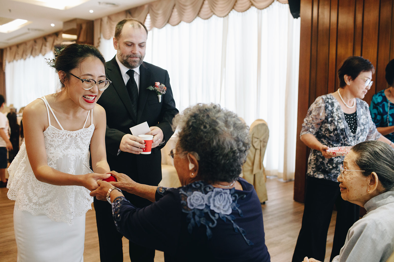 This important Chinese tradition is where the bride and groom serves tea to family members. Matt got to address family members by their honorifics, in Mandarin and Teochew! In return, family give the newlyweds their blessings (and red packets).